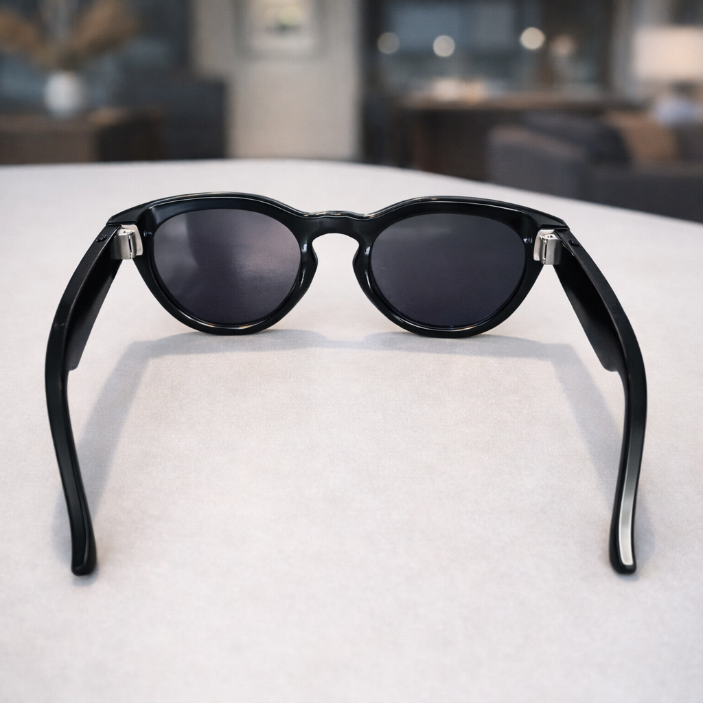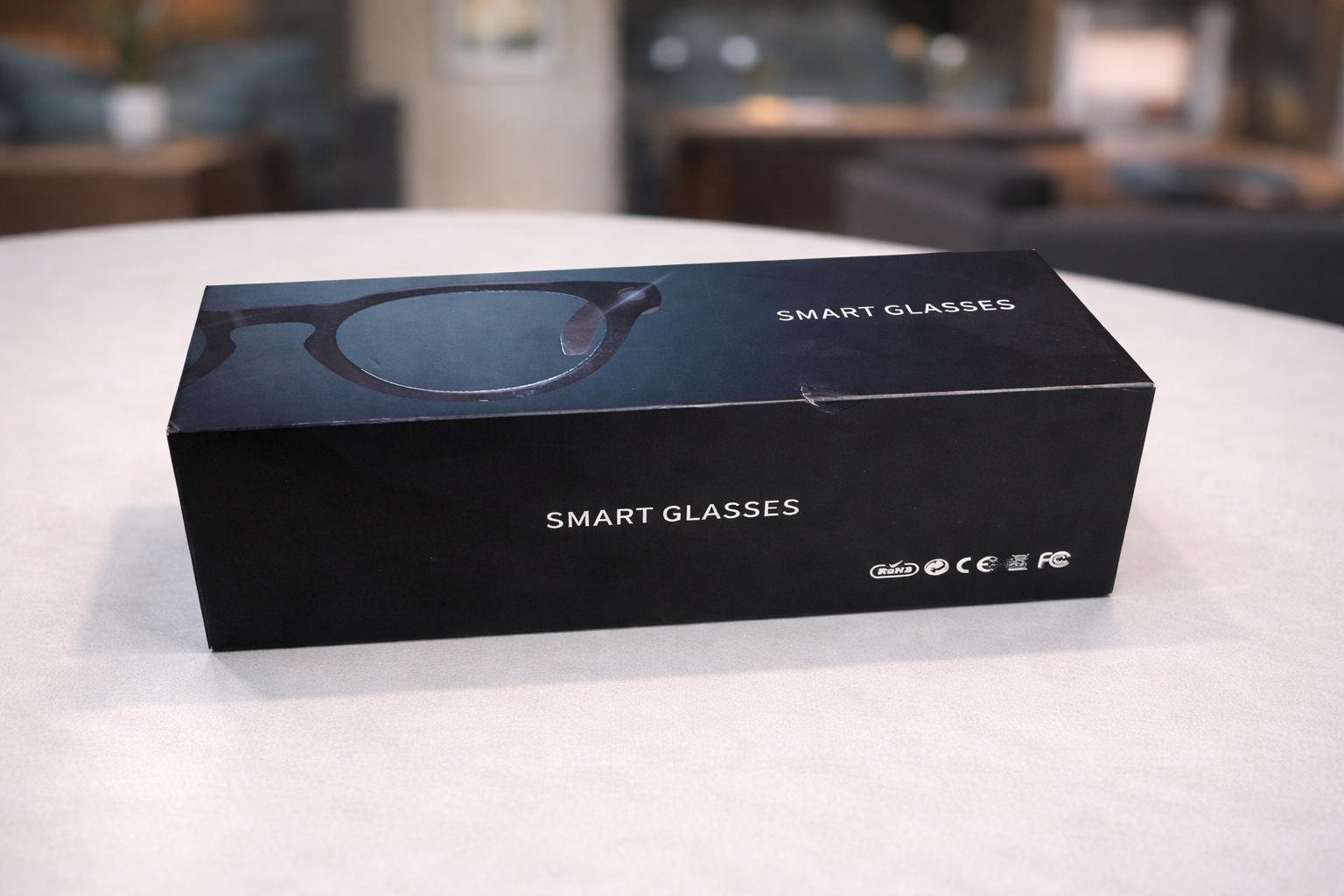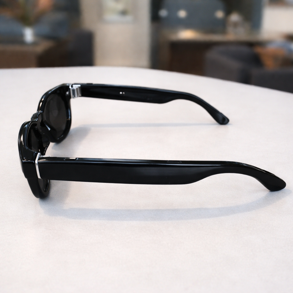 Stylish and innovative Smart Glasses with built-in Bluetooth, camera, speakers, and voice assistant support. Designed with a sleek black glossy frame for a modern, premium look.